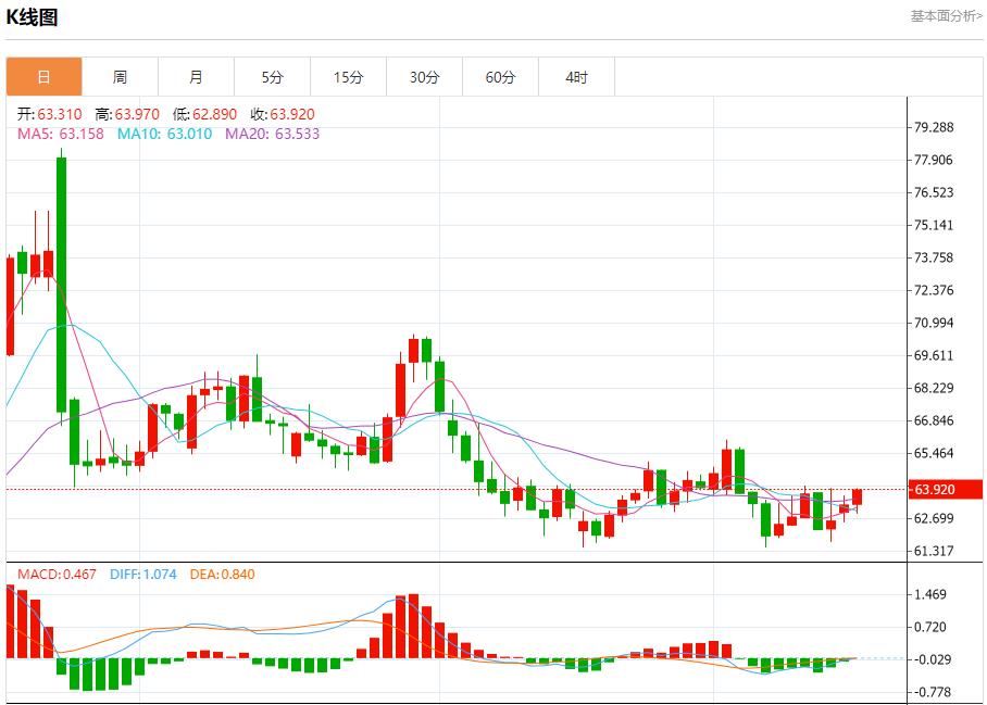 Crude oil market: As of 20:23 Beijing time, U.S. oil rose, now at 63.920, up 1.01%. Before the New York market, crude oil prices fell in the last day trading, due to the negative pressure of the stable resistance of US$62.85, and also touching the resistance of EMA50, exacerbating the negative pressure. Dominant by the main bearish trend in the short term, its trading level is accompanied by the tilt line, reducing the possibility of a rebound in the short term.