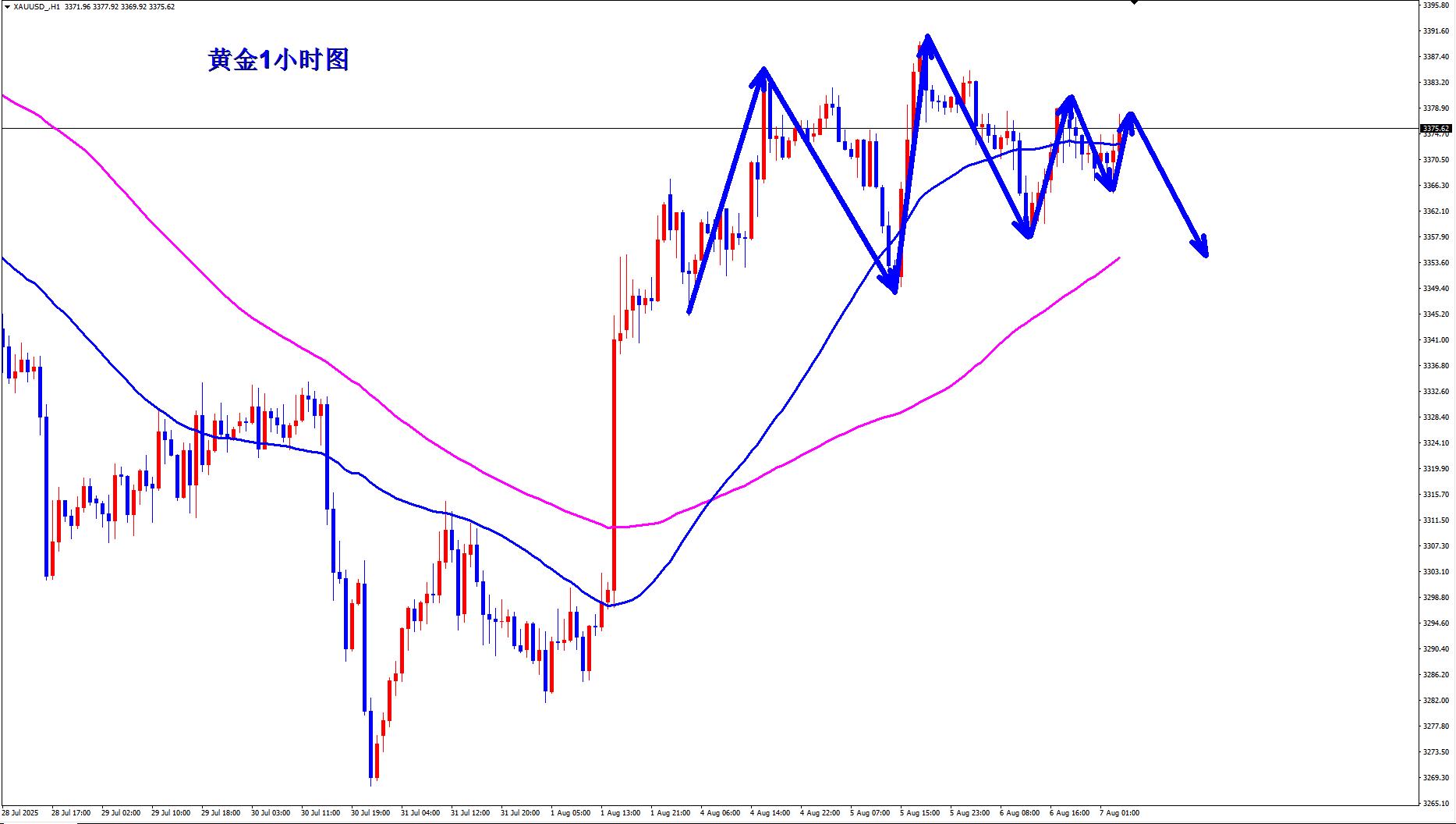 黄金1小时均线已经开始走平,如果向下拐头,那么黄金下跌空间将会打开,黄金反弹的高点也还是依次降低,黄金没有有效突破3390之前,那么黄金还是在高位反复构筑顶部,黄金早盘反弹3390下还是继续逢高空。