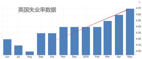 央行的政策变化往往会提前与市场沟通。英国央行行长近期的讲话并没有围绕货币政策展开,更多提及的是全球化以及美国贸易政策对全球化的冲击。英国央行其他官员将注意力集中在数字美元对欧元和欧元区金融体系的冲击方面。探求贝利对未来货币政策的观点,要追溯早更早时期。七月初,贝利表示:“我确实看到了一些潜在的疲软,尤其是在劳动力市场,而劳动力市场正在走软”。数据角度看,英国失业率连续九个月升高,最新值为4.7%,相比8月份高出0.7个百分点,逼近5%的警戒线水平。只有保持宽松货币政策,降低企业压力,劳动力市场才能持续获得提振。