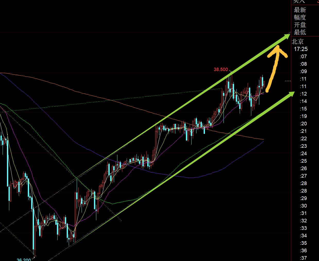第二,白银方面:昨日仍围绕上行通道保持完好,一路台阶式的拉升破高,最终抵达38.3一线目标,并有所上破;