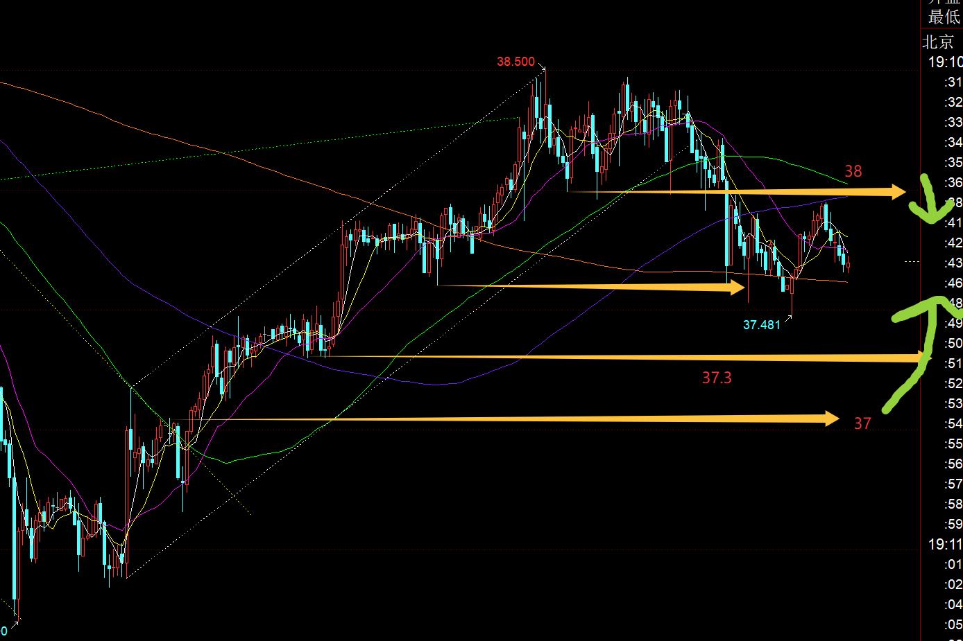 白银方面:白银上周一路连阳V拉升,本周一也是出阴打压修正,接下来几日也要震荡整理下,今晚留意几处支撑37.3、37,日线级别靠近37是一个不错的强支撑,预计极限此处也差不多了;而阻力比较明确就是38,一旦突破站稳它,又会开始逐步走强;因此,今晚38-37之间运行,37.3顶底位置也存在支撑,企稳都可短线看涨,冲不过38可看回落;