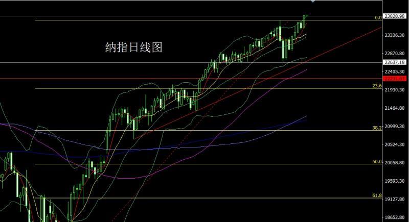 纳指市场昨日开盘在23526.86的位置后行情先回落给出23490.6的位置后美盘受到基本面利多因素影线强势拉升,日线最高触及到了23850.19的位置后整理,日线最终收线在了23844.14的位置后行情以一根下影线稍长的饱和大阳线收线,而这样的形态收尾后,今日23700多,止损23640,目标看23850和23900和23950.