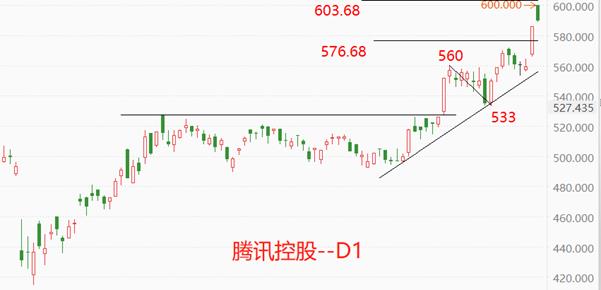 财报公布当日,腾讯控股大涨4.74%,隔日延续涨势,最高触及600港元整数关口。由于今日开盘跳涨,今日K线最低价仍高于昨日K线最高点,日内回补缺口的需求较为强烈。