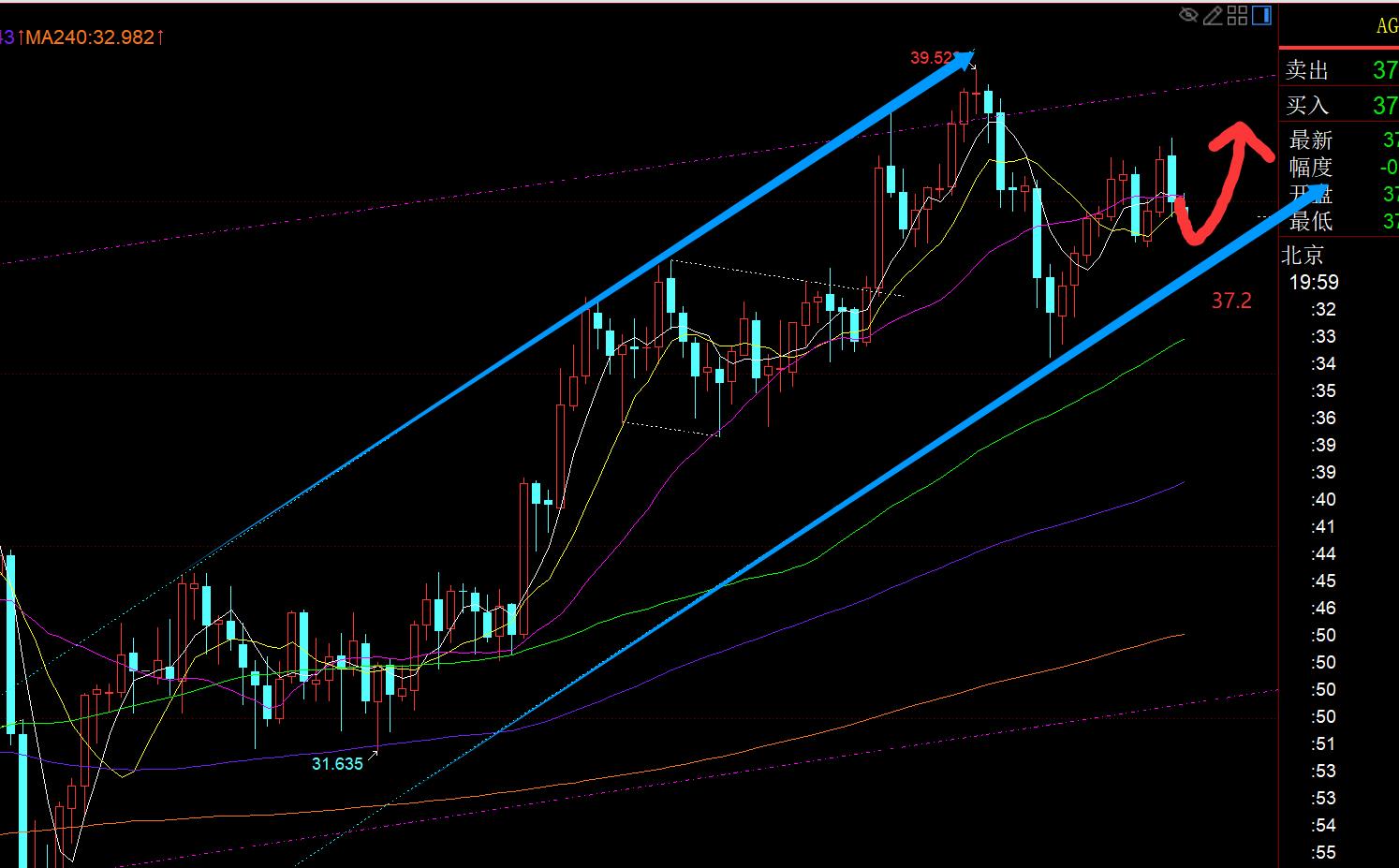 白银方面:从日线级别上升通道来看,强支撑是37.2一线,此位置上继续保持看涨;37.6上可能仍有些支撑,也要观察;日内风水岭阻力38.1,一旦突破站上此位置,则会逐步向上发力;