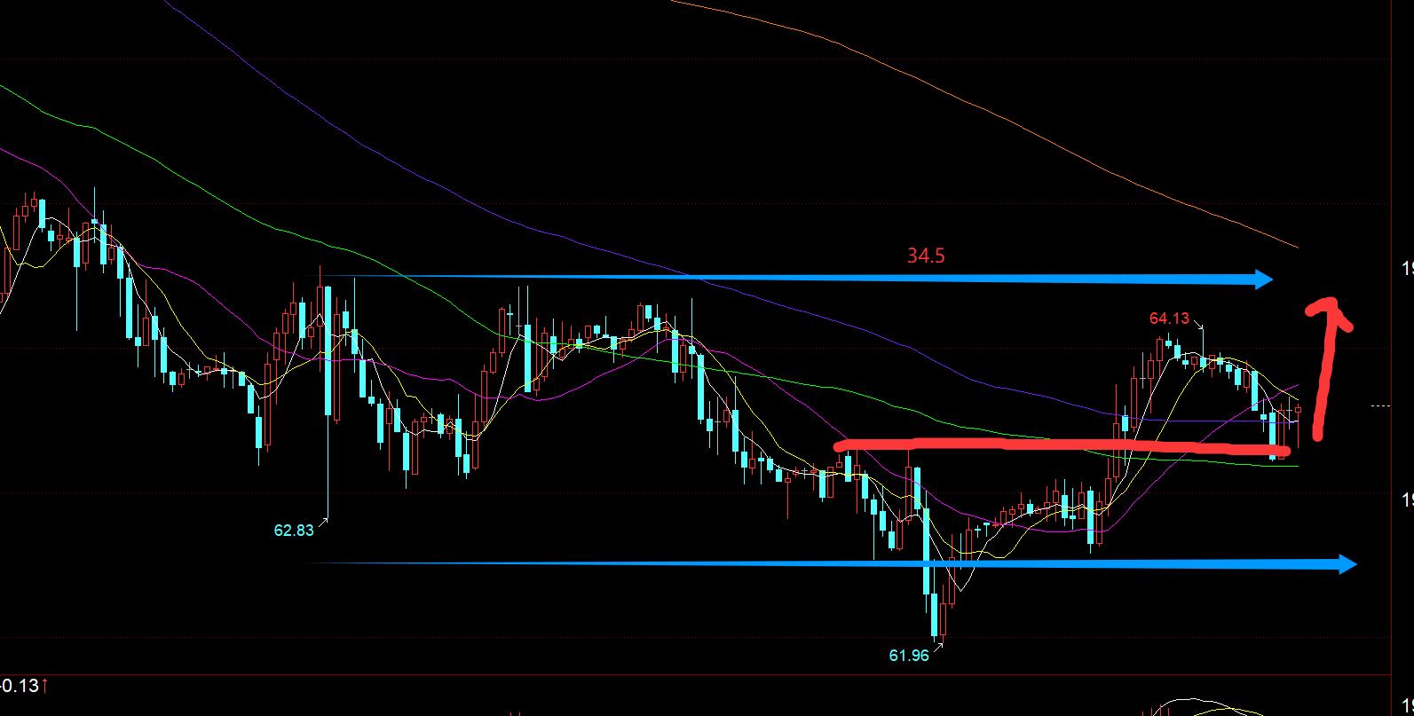 原油方面:日线昨日收不错的阳K,收盘终于站上5均线,那么今日尝试看涨反弹,初步看一波超跌反弹修正;63.3一线作为顶底支撑,能一直稳住此位置,则向上看64.5,也只有突破站上它,才能正式迎来超跌反弹;反之,若今日又冲高回落,收盘于5日之下,那么又要走弱;