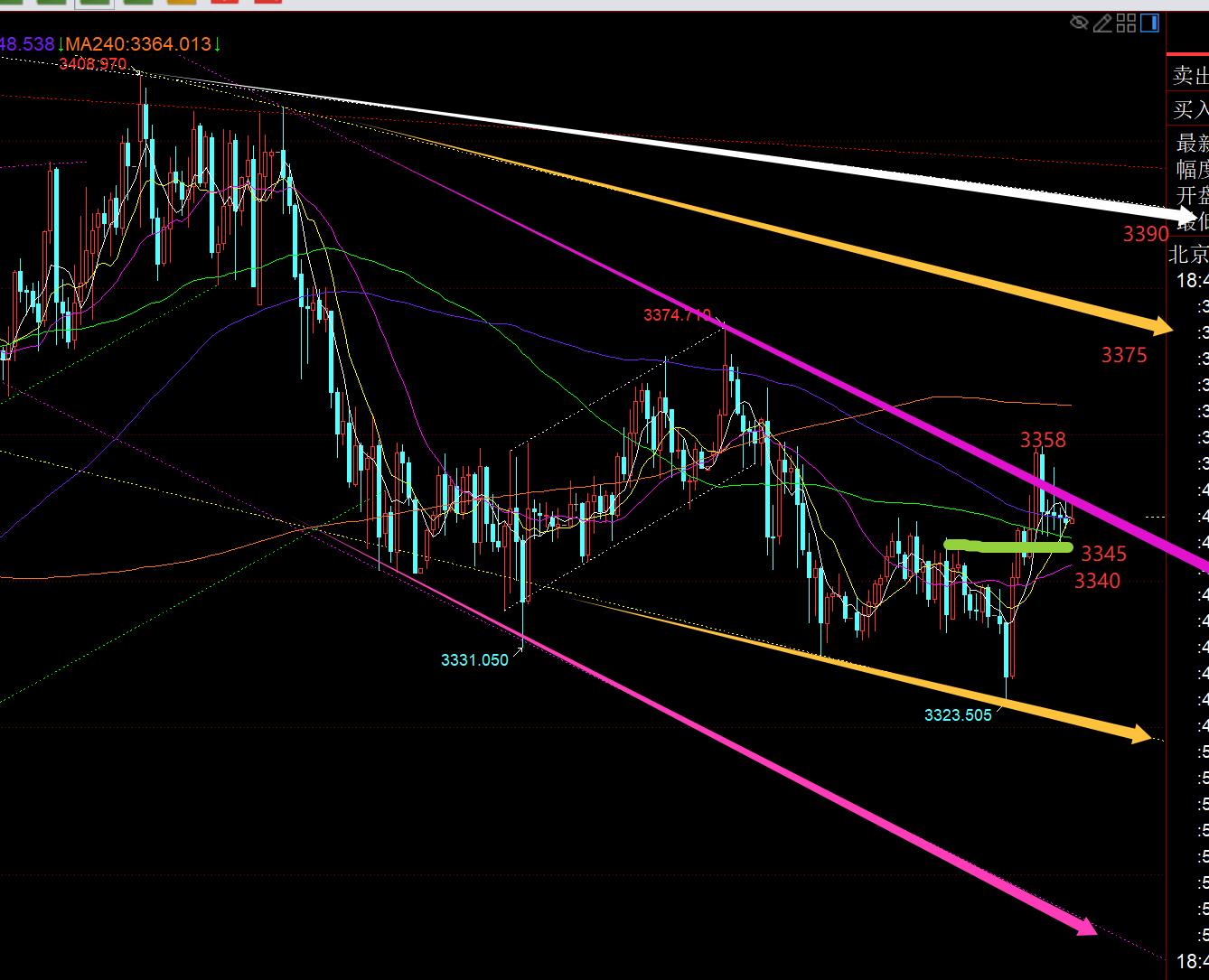 第三,黄金小时线级别:早间先出现一波急跌,触及3323企稳来了一波小V持续拉升,而3322位置是等了两日多的短线看涨点,它是3409-3267回踩的618分割位置,然后今日早间打开一看,原来也刚好处于上周五扩散三角的下轨支撑,一下子拉升至3358高位;13点收报的一根饱满大阳,突破站上了3404-3375这条下滑阻力线,但可惜屁股没坐热又溜走了,并未站稳,冲高回落之后,整个欧盘就一直卡在3345-3350这5米范围内窄幅不动,3345是处于今日早间这一波拉升回踩的382分割位置,若连这里都无法下破,就意味着这一波小V拉升动能还可能存在,不过几次测试3404-3375这条下滑阻力线又承压不上,得重新突破站稳它了,才能进一步延续上攻,再突破3358的话,就应该会试探3375前高,甚至3390图中白色趋势阻力线;但拉高之后,按照循环,它可能还有一次震荡下滑打压,起码会再度回踩3350,甚至更低,只不过再低,肯定不会低于3323了,最后稳定于再度回踩的低位之后,发力,再上攻就是第四次去测试3430-3450压力区了,这是想要再创历史新高之前得重点承压范围; 因此,总结下来就是先守住3345的前提下,则认为3323企稳的这一波小V拉升动能还在,会去测试3375,甚至3390,然后打压一波至3350,或更低,再企稳之后去上攻3430-50,这个过程需要几个交易日,不是一蹴而就的,一步步谨慎验证;当然,若3345-3340又重新失守向下了,那么可能第一波3408高点下来的震荡下滑打压还没结束,还要继续底部震荡一会再寻求企稳;