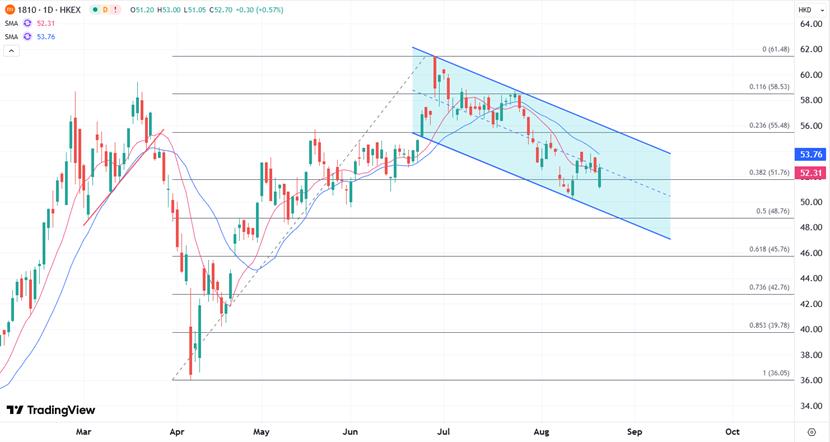 小米股价原本接近上周触及的近两个月低位,但在绩后实现反弹,当前技术上仍面临来自10日均线的压力,暂时可能维持在近两周的相对区间交投,但有望借助下行通道底部实现再一次反弹,重返55港元上方为技术上重启上行的关键。