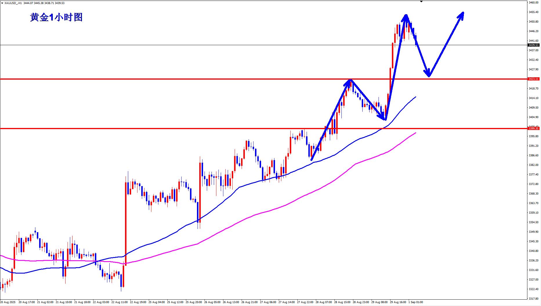 黄金1小时均线现在还是继续金叉向上的多头排列发散,1小时结构现在还是标准的多头趋势,回落还是继续顺势多,黄金周五继续突破多空关键位3423,短期黄金3423已经形成支撑,黄金早盘回落3423不破,就继续逢低做多。