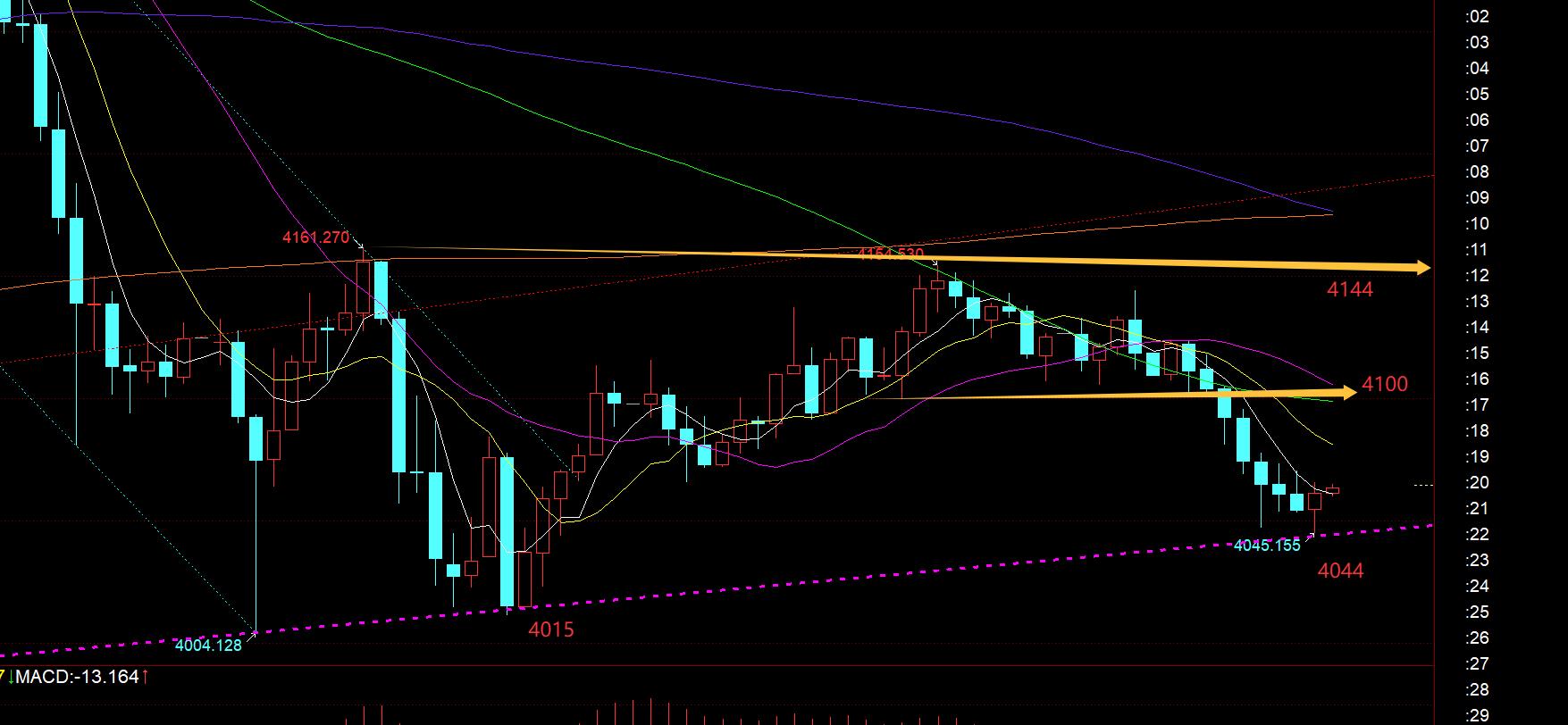第三,黄金小时线级别:隔夜企稳4105反弹,今日早间再次下跌只4105上双底反弹一波至4144,价格重新站上了66日关键均线,因为昨晚就是一路压制此均线震荡下滑的;那么阳线收盘突破站上它后,就以为守住4105,可以延续一波上行,结果横盘整理几个小时,午后下破4100引发一波下跌,最低打到了紫色趋势线4044,并且得到了一定的反弹效果,说明这条3311一路支撑的线仍是有效的;但由于今日欧盘走弱,美盘前后反弹则可能诱多,还有二次打压,所以今晚还需再次考验它的得失生命力,若二次下滑依然稳住4044附近,则会继续走底部区间反复,去4100的上方,乃至上轨4150-4160;反之,若收大阴或连阴收盘于4044之下,就要谨慎多,观察它的延续下跌力度如何,下方还有4033、4025、4015、4004等几个支撑;另外,美盘前后先反弹阻力留意4080和4100,承压可看二次压制下行;一旦重新站上4100之后,就谨慎空,观察延续拉升力度如何,上方4144、4160-4180;