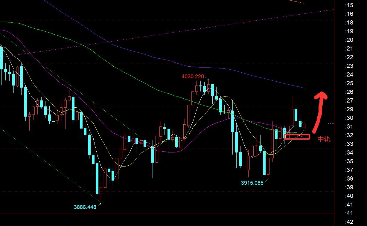第三,黄金小时线级别:今日的走势相对比较动乱,延续性较差,迷惑性也较强,比如11点收饱满大阴,会有不少人认为会破位走弱,去跟随隔夜的下跌,结果直接一个小V拉升破了早间开跌口;突破3966之后,回踩此处去跟随看涨,结果跌至3947,幅度是不大,但短线只要位置稍微入高一些,10米损是很容易的;欧盘横盘整理4个小时,18点最终大阳突破,又会不少人去破位跟随看涨,结果后面两个小时又打回原形,总之就是延续性较差的震荡反复走法;对于今晚来讲,欧盘一直压制中轨不上,而大阳突破之后,也是强调耐心等靠近中轨再看企稳拉升,前一个小时测试中轨完毕,接下来就就看它的反弹力度了,阻力4000-4011,若能突破,那么力度是可以的,会延续至4030,甚至往日线中轨4060去靠拢;【注意,中轨附近进场的,防守可以上移本钱保护了,那样就是无风险持仓,踏实拿着】
