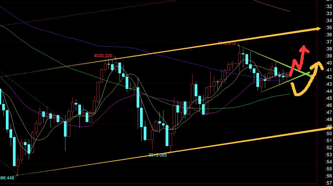 第三,黄金小时线级别:隔夜强势收盘于高位,今日一早开盘就惯性续涨一波,最高4047,逼近4050阻力目标;等到10点收线出现冲高回落K,则意味着存在震荡下滑力度,首先关注的是中轨,当时4002-03支撑,首次触及是出现了一波快速拉升至4017,预期给的短线目标是4020,略差,随后快速回落,破4000也就不好去持有;下方第二支撑则等待3980继续看涨,但最低3988,依然未给到机会,收阳又回到中轨之上,则4000接回看涨,最终还是抵达了4020目标;欧盘压制4026回落,此时处于图中小收敛三角内部整理;下轨支撑目前4004,上轨阻力4018,守住欧盘低点3998不破之前,还是倾向于震荡向上看,因为日线是底部看涨的;当然,要有效突破收敛上轨4018,才能有向上进一步推动的动能;若向下跌破3998,那么再去留意3980一线支撑的企稳情况;