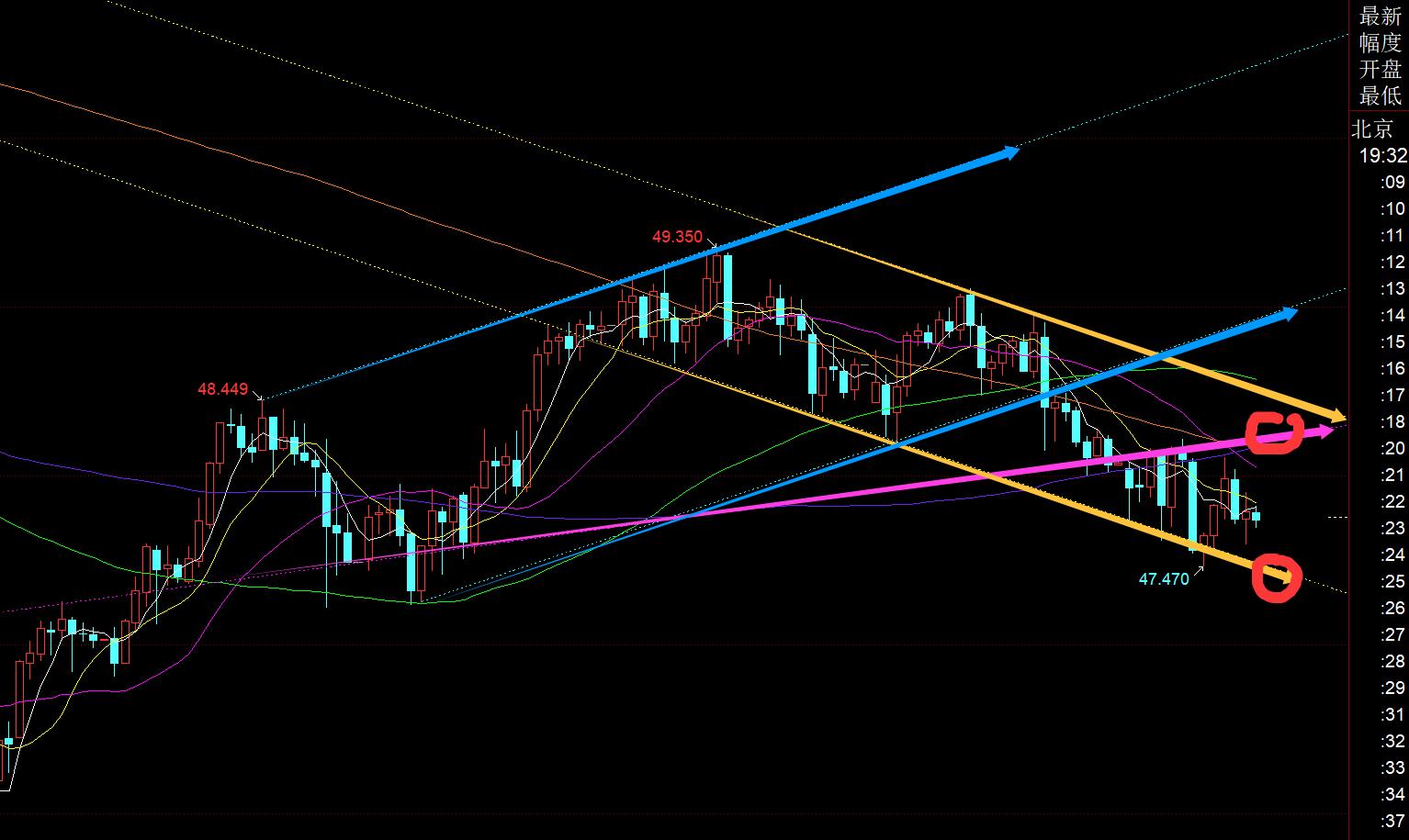 第二,白银方面:白盘先围绕短期上行通道下轨支撑48.4上看涨,抵达48.85拿下,最高49;美盘再回踩靠近此下轨继续震荡看涨,但夜间下破了则出局失败;