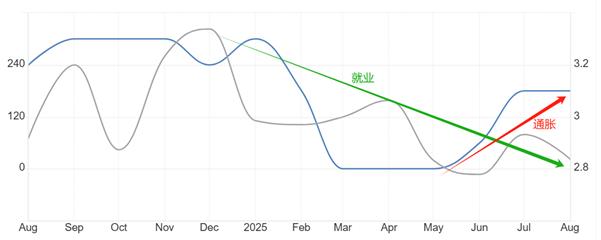 El significado de Powell es claro: la Reserva Federal se enfrenta a una dilemma, los recortes de tasas de interés pueden conducir a altas inflaciones de inflación, y los recortes no ratados pueden conducir a la no emergencia de inicio. La imagen de arriba muestra la tasa anual de IPC central en los Estados Unidos y los nuevos trabajos no agrícolasLa tabla de superposición de los datos orales muestra que la inflación aún se está recuperando, mientras que la población de empleo no agrícola continúa disminuyendo. El último valor de la tasa de inflación central es del 3.1%, que todavía está por encima del estándar de inflación moderado del 2%. El número de nuevos empleos no agrícolas ha caído bruscamente a 22,000, mucho más bajo que el pico de 323,000 el año pasado. Aunque la Fed reinició los recortes de tasas de interés en septiembre, si las tasas de inflación aumentan significativamente en los próximos meses, es posible que no sea posible continuar reduciendo las tasas de interés en noviembre y diciembre de este año.