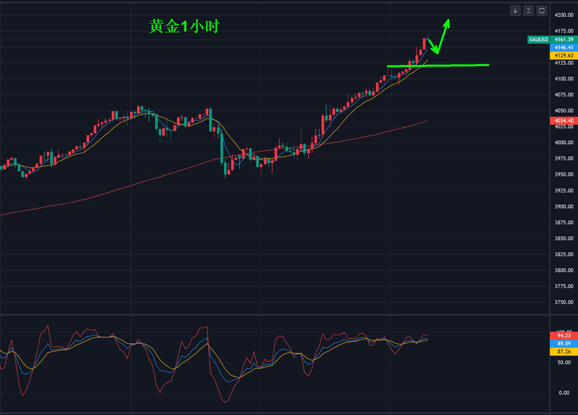 Questa volta, il prezzo dell'oro si è adeguato di 100 dollari da 4.060 dollari, e ha fatto un secondo salto al rialzo. Ora si è rinfrescato sopra i 4.160 dollari. È aumentato di 200 dollari dopo essersi aggiustato di 100 dollari, e si sta avvicinando a 4.200 dollari. L'attenzione è sulla media mobile di 1 ora 5/10 xmserving.come punto di supporto.