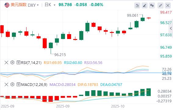 周二,美元指数走强,升至逾一周高点,最终收涨0.49%,报98.59。在美国三年期国债拍卖吸引了强劲需求后,美债收益率普跌,截至目前,美元报价98.78。