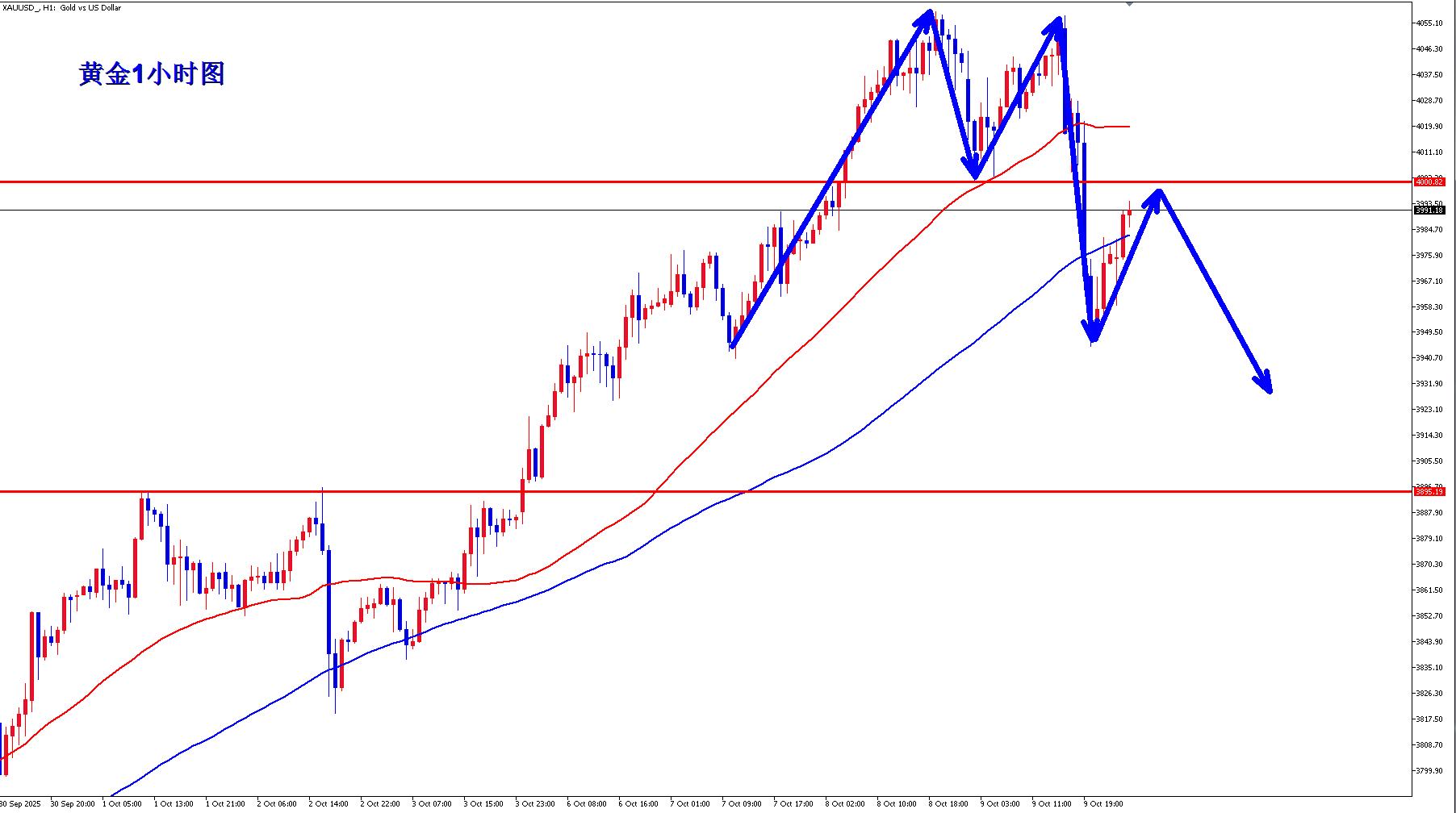 黄金1小时均线已经开始向下拐头,黄金1小时上涨力度已经不足,黄金1小时形态已经形成双重顶部结构,黄金短线承压4000下逢高就是空的机会,不过现在黄金的节奏也很重要,那么就是今天如果一直没有大幅回落,而是继续在欧盘还维持强势,慢阳上涨的节奏,那么黄金可能就又要用时间换空间的调整,那么黄金可能还是可能继续上行,然后在消息的刺激下强势拉升,完成洗盘,所以今天的强弱很关键。
