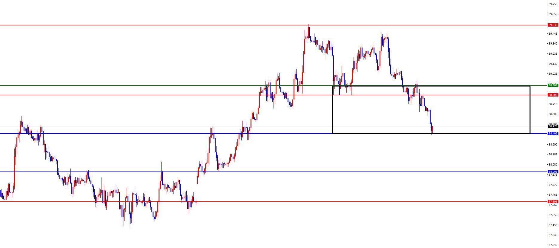 从多周期分析,周线价格经过前期持续震荡后于上周进行站稳,目前周线支撑于98区域,后续关注进一步中期多头(需要注意缺口位置)。从日线级别看,随着时间的推移目前日线支撑于98.40区域,此位置是波段走势的关键,价格目前已经触及,关注今日收盘表现。从四小时上看,在周二价格晚间进行跌破四小时支撑后,价格短线偏承压修正,这个也是我们在周二强调的重点,价格目前已经如期承压测试日线支撑区域,目前四小时阻力于98.80-90区域,后续价格只有站稳此位置才会继续发力上涨,否则短线还是偏空(谨防价格进行回补97.70缺口区域)。一小时上目前价格依旧处于偏空表现,但是需要注意日线支撑的反弹。所以综合所述,目前价格在98.80-90之下短线偏空,只有上破站稳才能看多头表现,大家一定要注意市场节奏)