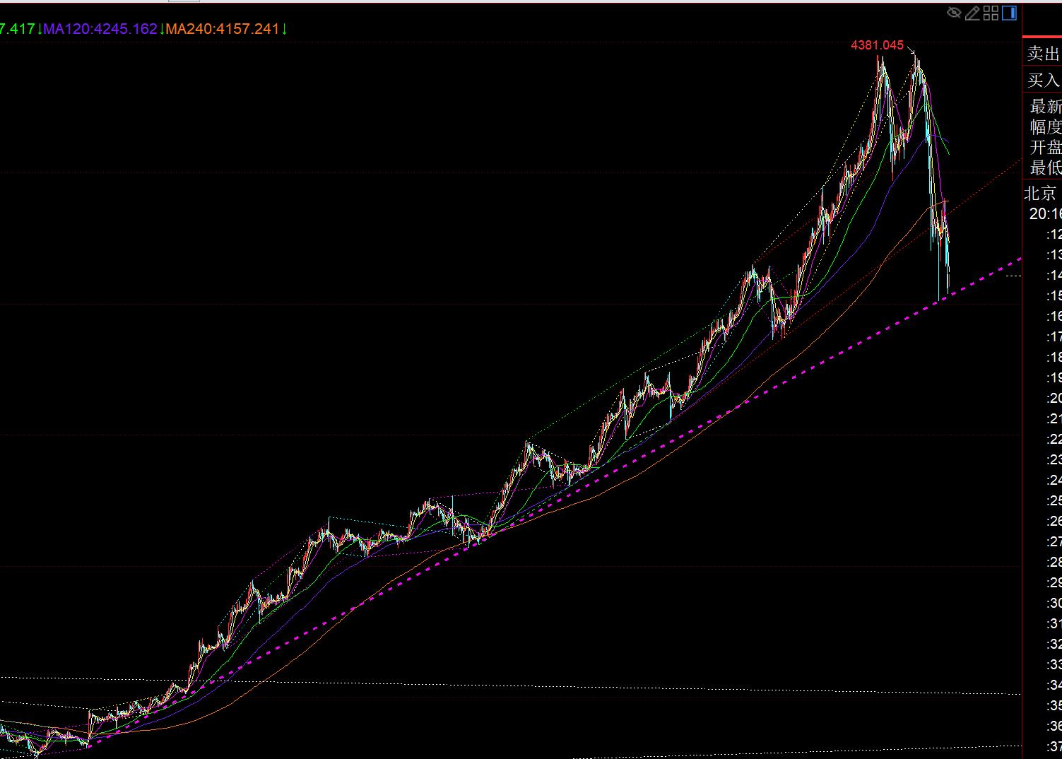 第一,黄金方面:昨日从4380直接砸到今日低点4004,创下历史单日最大跌幅记录;而这一波下滑就是开始选择去修正3311一路单边拉升至3481的涨幅;那么从低点3311到高点3481,分割一画,可以知道目前还没打到382分割位置3972,说明整体依旧维持强势拉升趋势,而快速打压修正反而是有利于后期企稳更好的去继续刷历史新高;一路慢跌阴跌下跌才可怕,急跌是不可怕的,因为它短时间内马上会结束抛售;当前4004低点是逼近日线中轨,也逼近周线5均线,的确存在一定的心理关键防守,不过想要有效企稳,日线必须至少出一根底部大阳或较长下影K;另外,它若下破4004,也可能会来一个假摔,就是先阴线下破于日线中轨,第二日或第三日大阳收回去,今年2月份和4月份都经常出现这种走法,这点也要留意,即便下去了,也不要慌,下方空间不会太大,4004之下,还有3945、3914等关键支撑;而日线上方阻力比较清楚,就是短期5日和10日会陆续成为反压,只有哪天突破站上5日,那么会回归趋势强势拉升阶段;