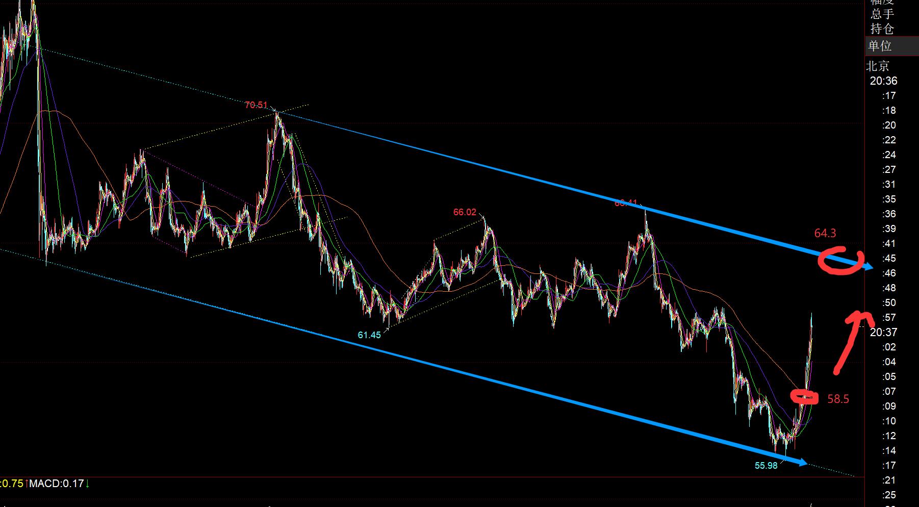 原油方面:这两日由于制裁,油价短线走高,当突破小时线年均线时,就意味着向上会有延续拉升动能;从图中通道看,仍处于下行中,上轨64.3一线,今天亚欧盘持续走高,美盘前后出回踩动作可二次看涨,关注58.5之上找位置企稳看反弹;