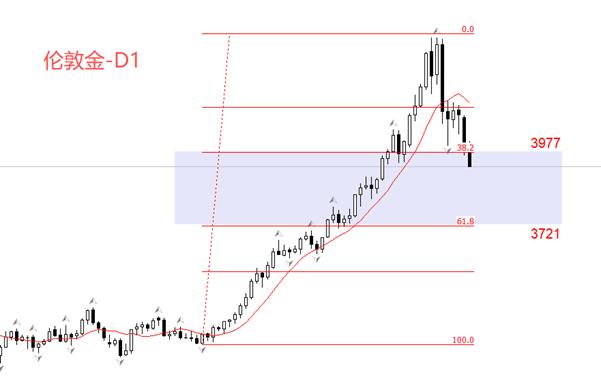 技术角度看,黄金日线在本月20日触顶,随后开启剧烈下跌。前一轮标志性上涨波段的0.382分位(3977美元)已经被跌破,继续下跌将考验0.618分位(3721美元)。在没有突发消息的情况下,考虑到下跌波段力度较强,0.618分位在中期内被触及的概率较高。