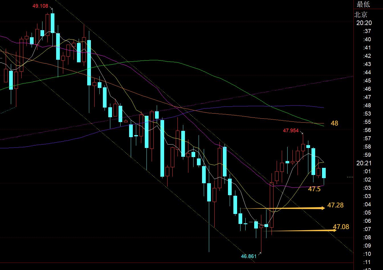 白银方面:昨日也是收报阳K,短期5日和10日就成为反压,今日关键承压点就基本在48一线;亚盘出现一波持续反弹走高,基本又把隔夜47.8开口的跌幅涨回;同时,图中看,前面黄色下跌通道也有所上破,那么这一波反弹能否带来好的延续拉升,就看今晚能否稳住47.28、47.08两支撑了,阻力48一线;