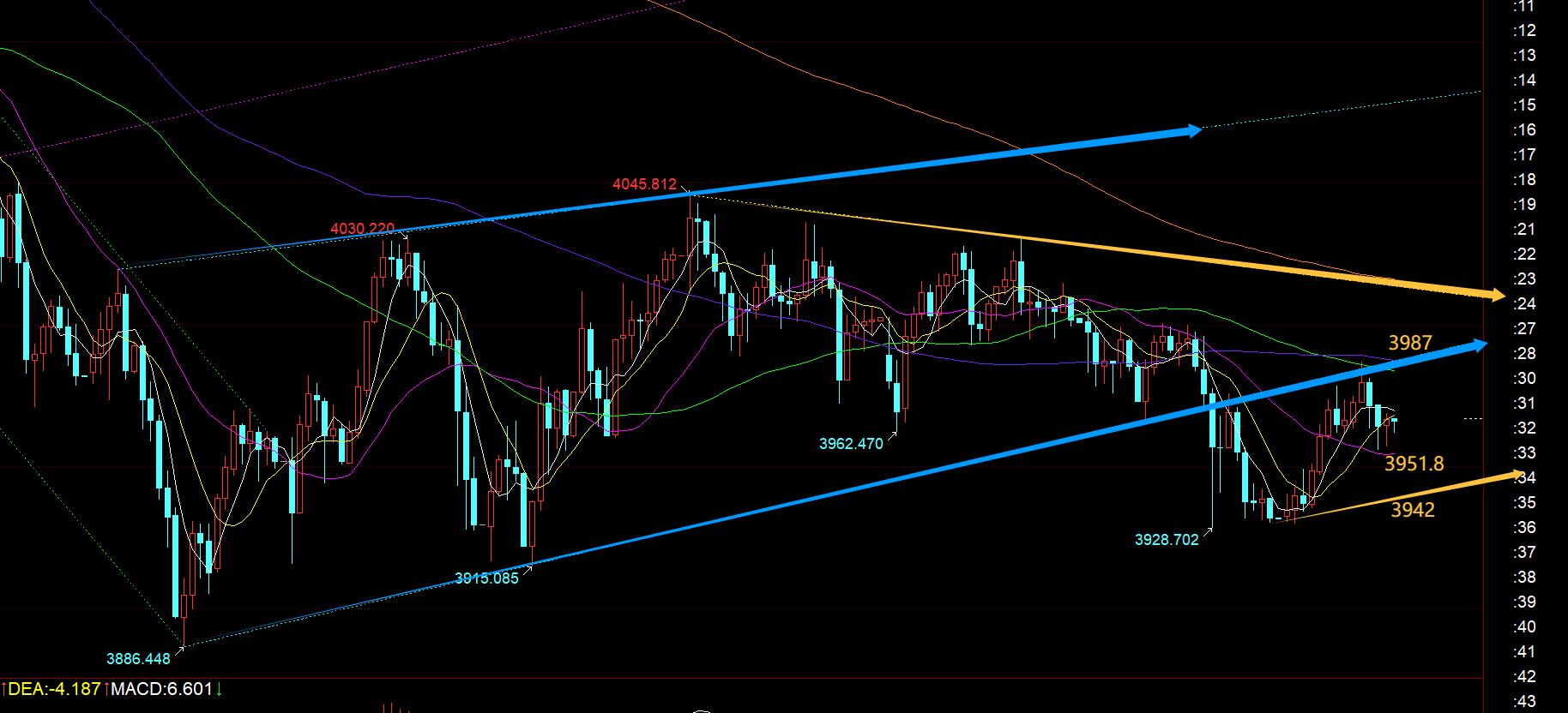 第二,黄金4小时级别:中轨阻力下移3987,刚好也是日内此时的高点,年均线支撑上移3930一线,今晚的运行区间大概在此范围内;