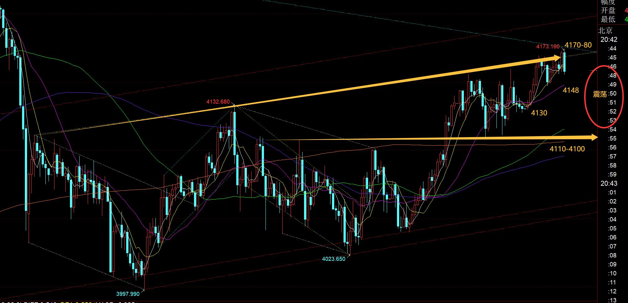 第三,黄金小时线级别:隔夜收线的位置4130刚好处于昨日高低点分割的618处,今日早间企稳4130收阳站上中轨,则果断4141跟随看涨,成功抵达4163-66图中黄色趋势阻力线;并且出现承压长上影K回落之后,4163反手看跌,抵达4150目标;原本4150-45是计划再次震荡看涨位置,当时15点收大阴,就保守下移至早间一波拉升回踩的618分割处4145-44,但可惜略差几米并未给到机会,而欧盘一直围绕4150-4170区间内反复整理,即便20点收阳突破了日内新高,也无法直接强攻延续,这主要是因为短周期macd背离太严重,指标未修复之前没动能,加上还有4175-78下重要承压点;因此,今晚认为,上方空间是暂时不大的,谨慎追涨,macd顶背离严重,容易冲高回落,可依托4170-4180范围内去尝试看跌回落,只要4180不突破,就不要追涨,下方支撑4148中轨,也是欧盘起涨点,跌破则关注4130日内低点,强支撑4100-4110区域,拉低支撑企稳可以尝试震荡看涨反弹,保持区间内震荡对待;